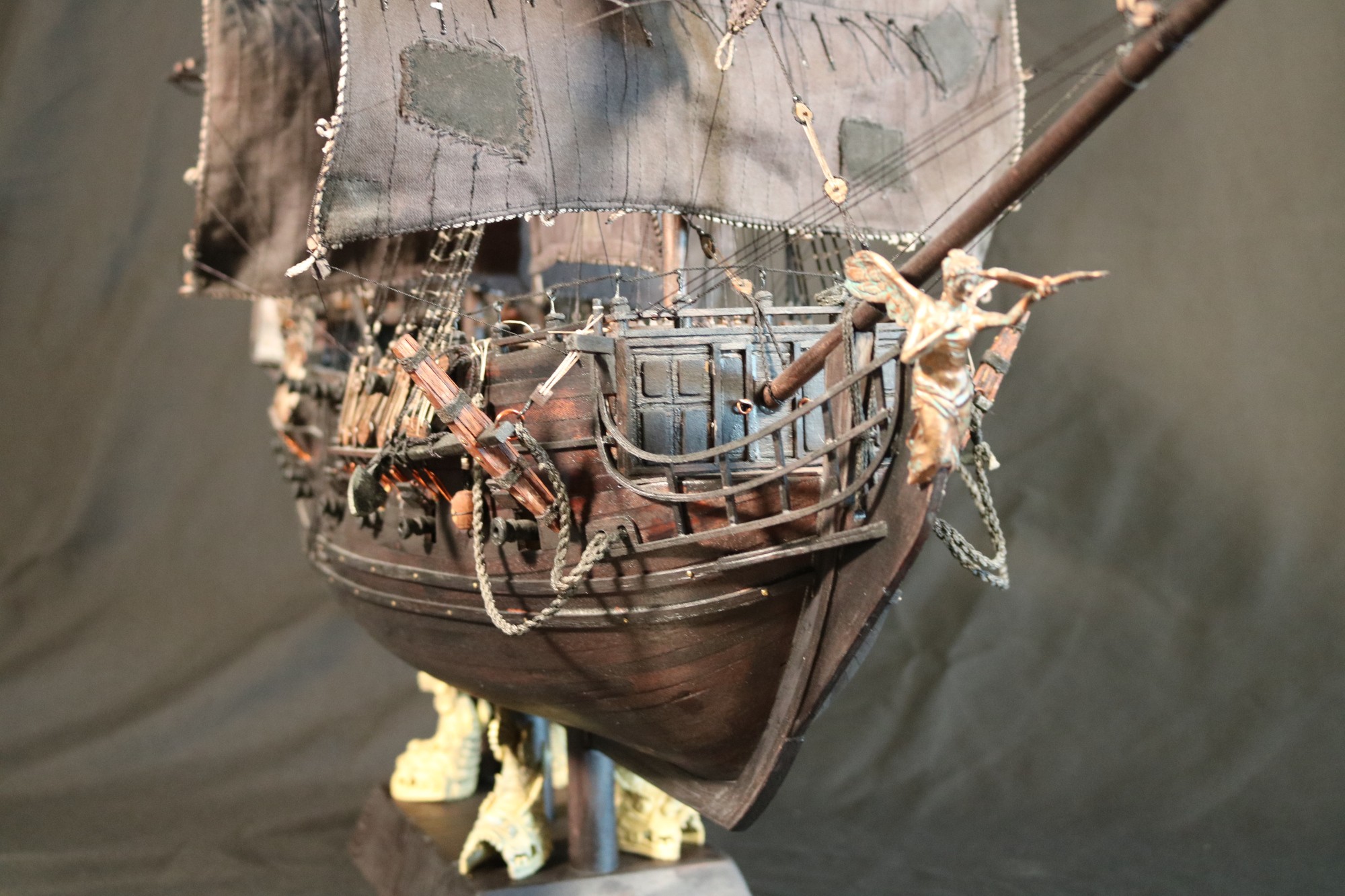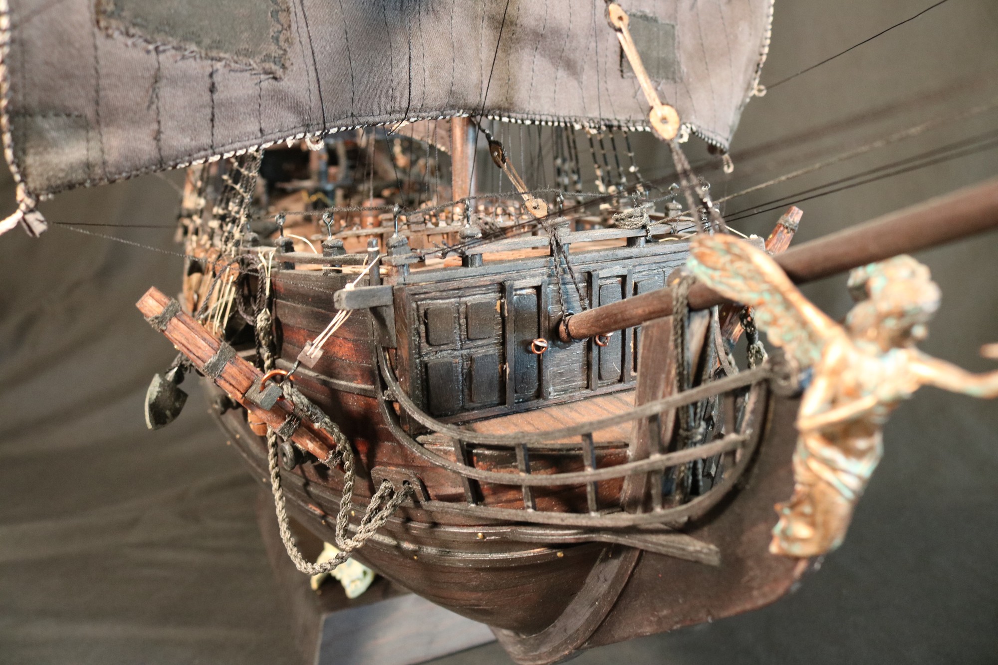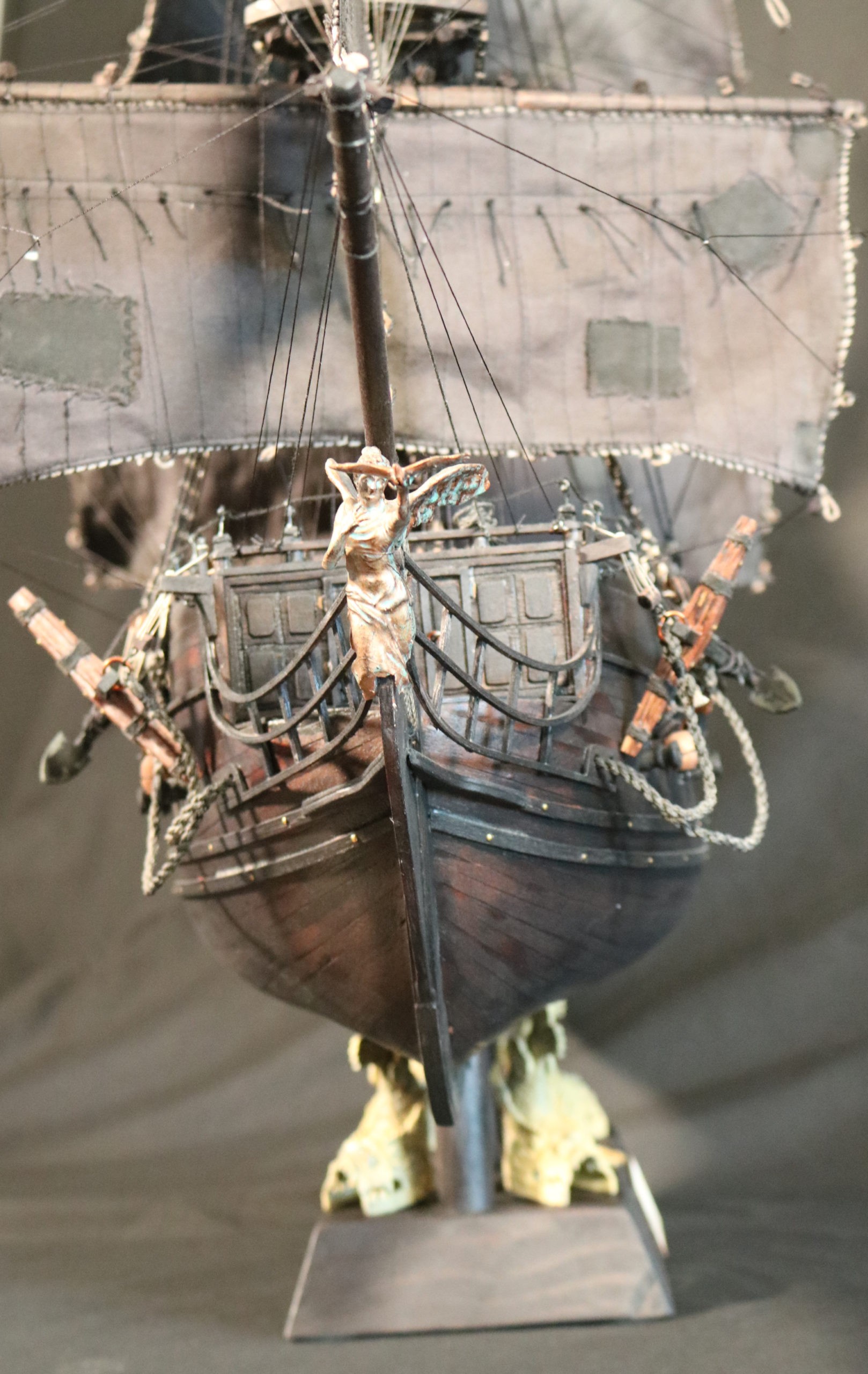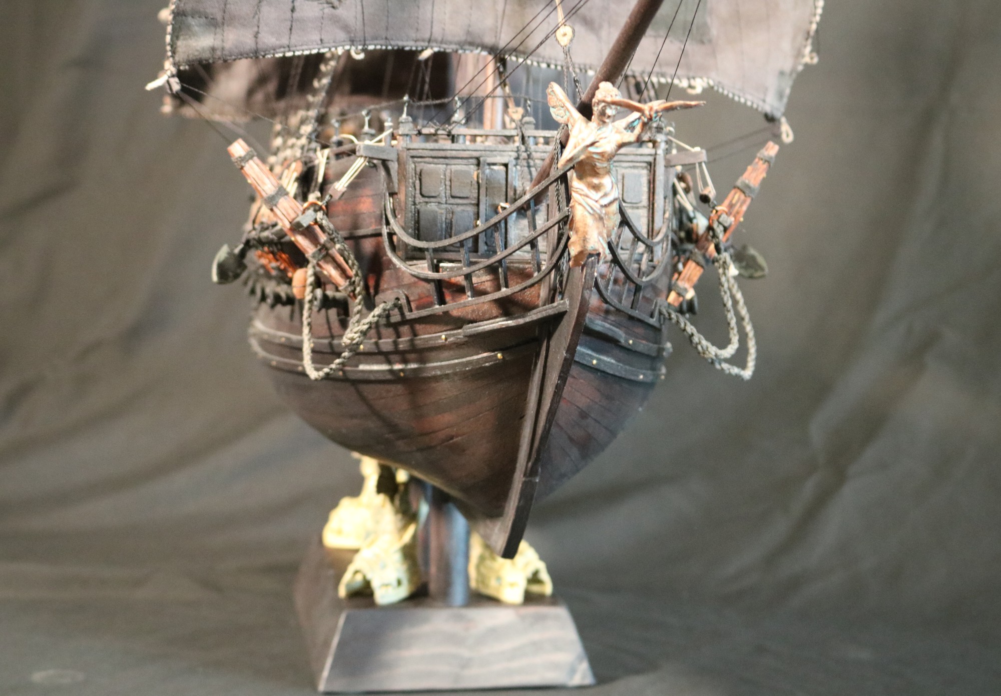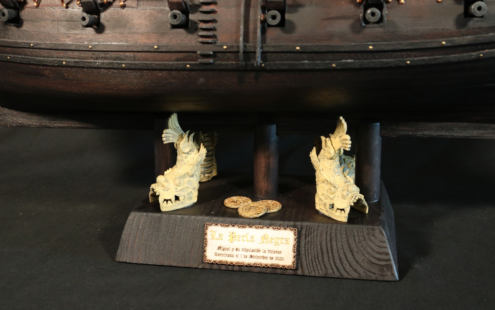 Aqui el barco empieza ya tomar el carácter que tiene. La figura del mascaron de proa de la Perla Negra es una mujer con una paloma en la mano mientras que con la otra se cubre ella. Sinceramente, había pensado hacerla en madera pero es una talla muy compleja asi que aqui si decidi darle uso a la impresora 3D de resina y sacar la figura con impresora 3D. En Youtube tenéis un tutorial muy guapo donde te explico como he creado el mascaron, como lo hemos imprimido, limpiado, curado, pintado y envejecido.