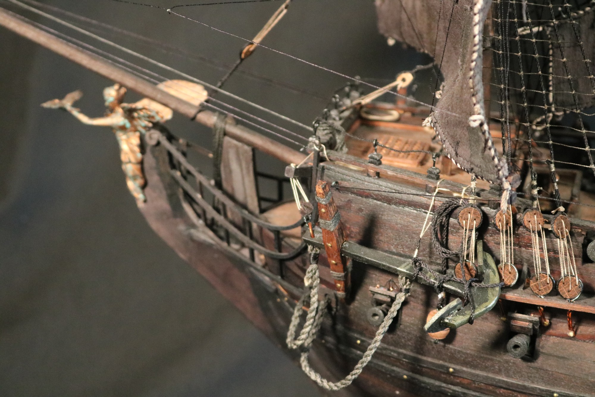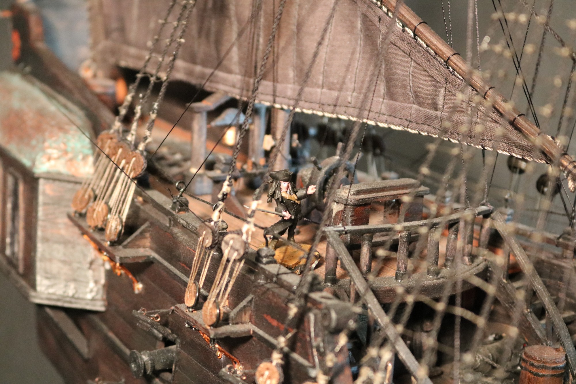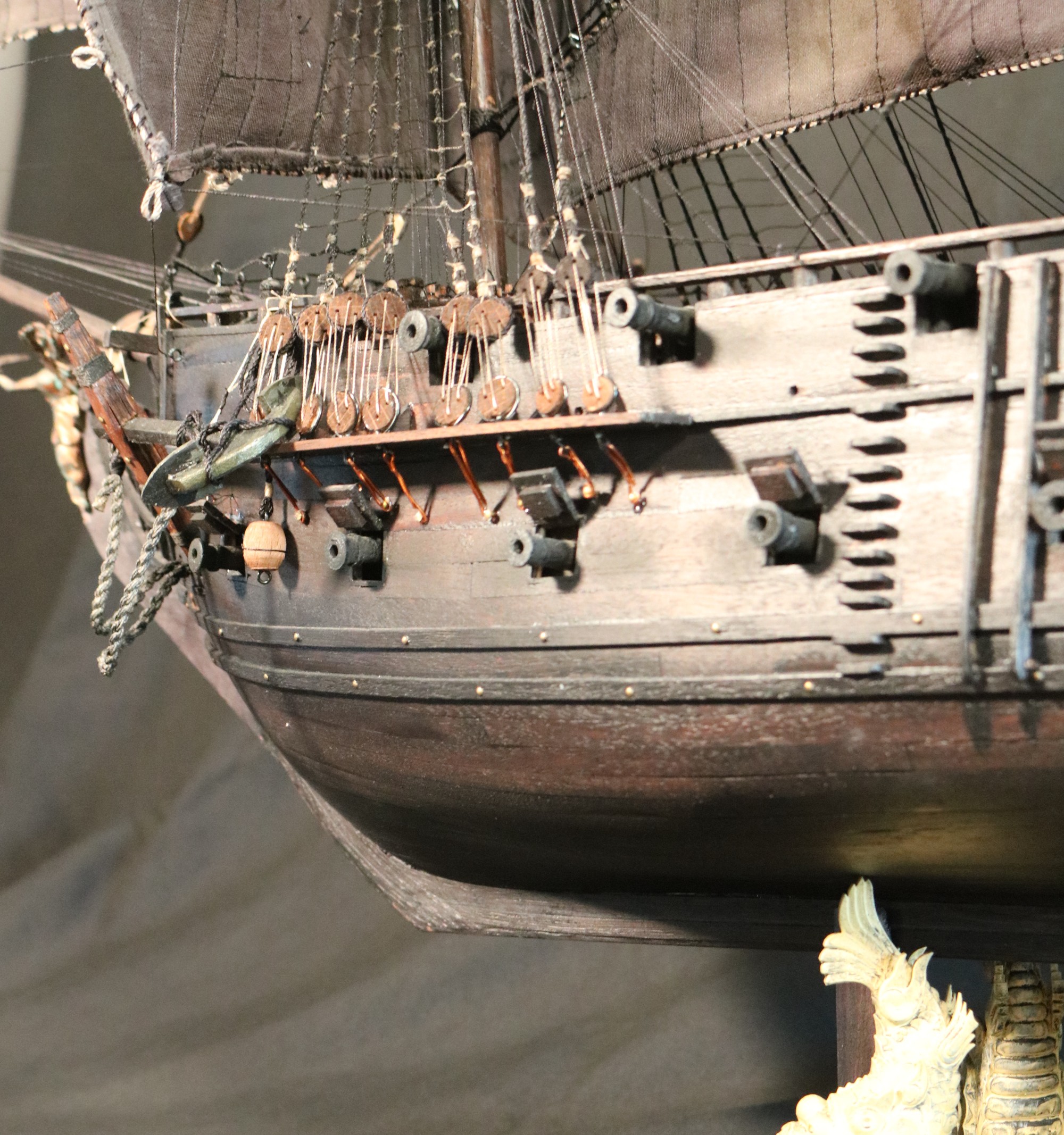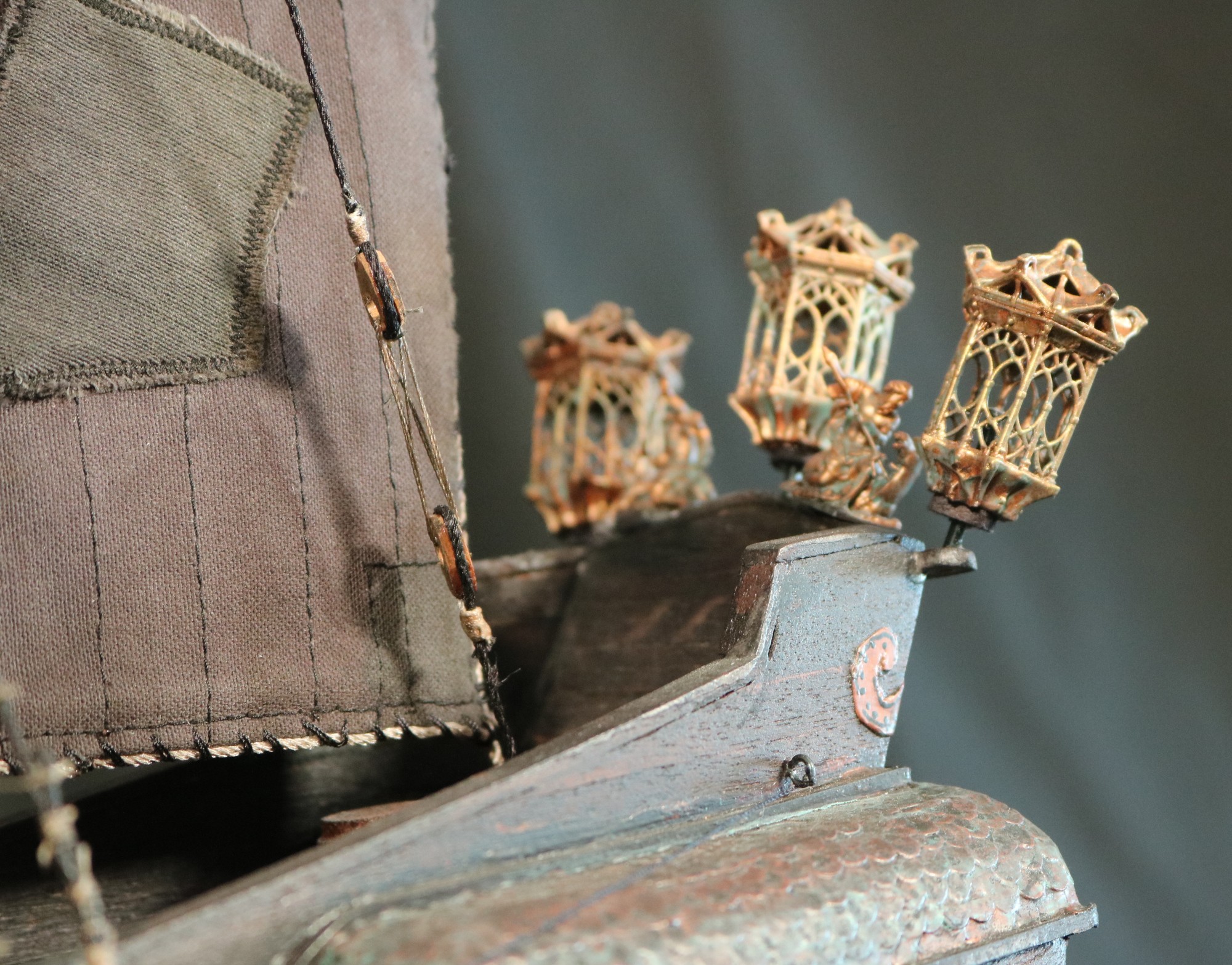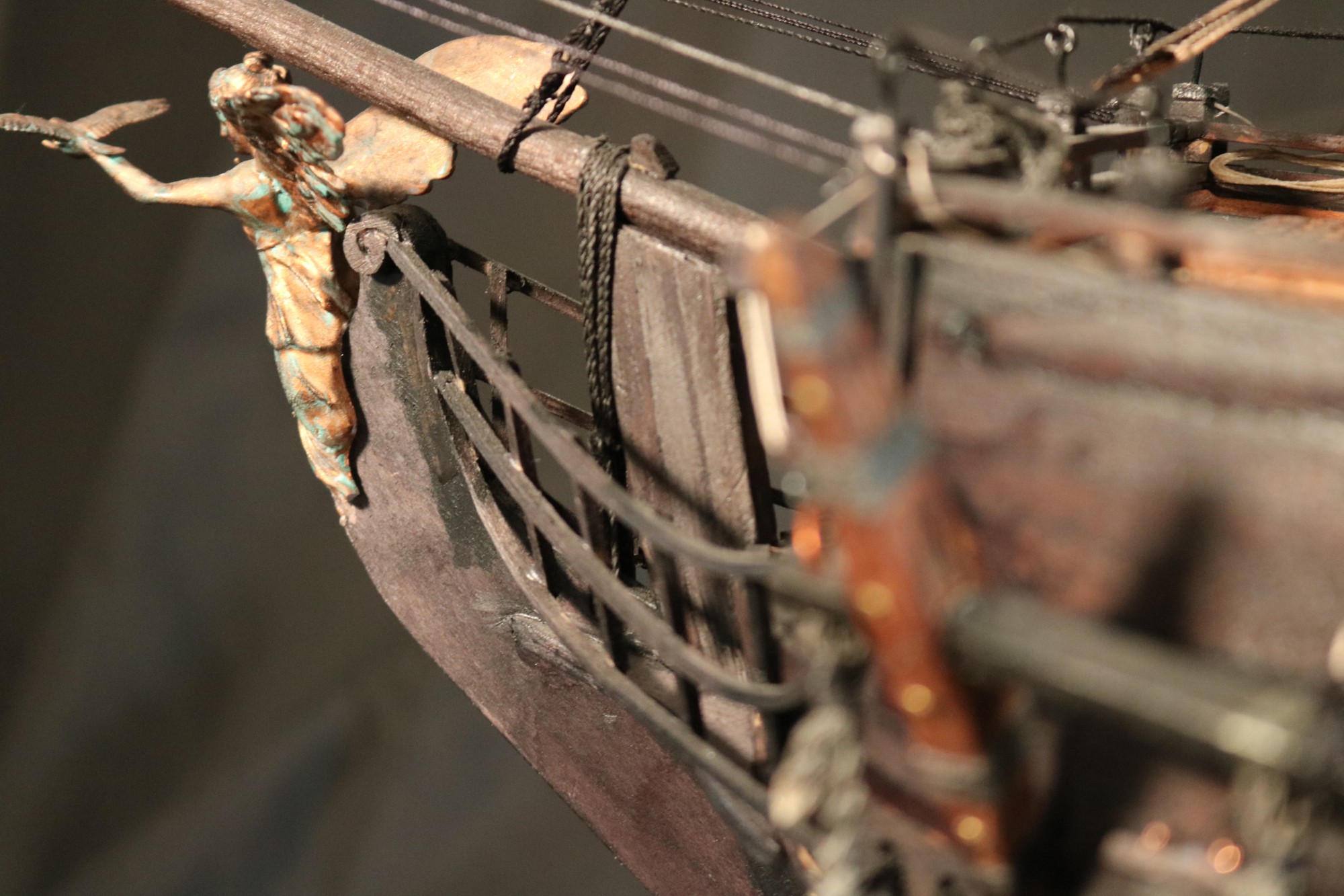 Aqui el barco empieza ya tomar el carácter que tiene. La figura del mascaron de proa de la Perla Negra es una mujer con una paloma en la mano mientras que con la otra se cubre ella. Sinceramente, había pensado hacerla en madera pero es una talla muy compleja asi que aqui si decidi darle uso a la impresora 3D de resina y sacar la figura con impresora 3D. En Youtube tenéis un tutorial muy guapo donde te explico como he creado el mascaron, como lo hemos imprimido, limpiado, curado, pintado y envejecido.