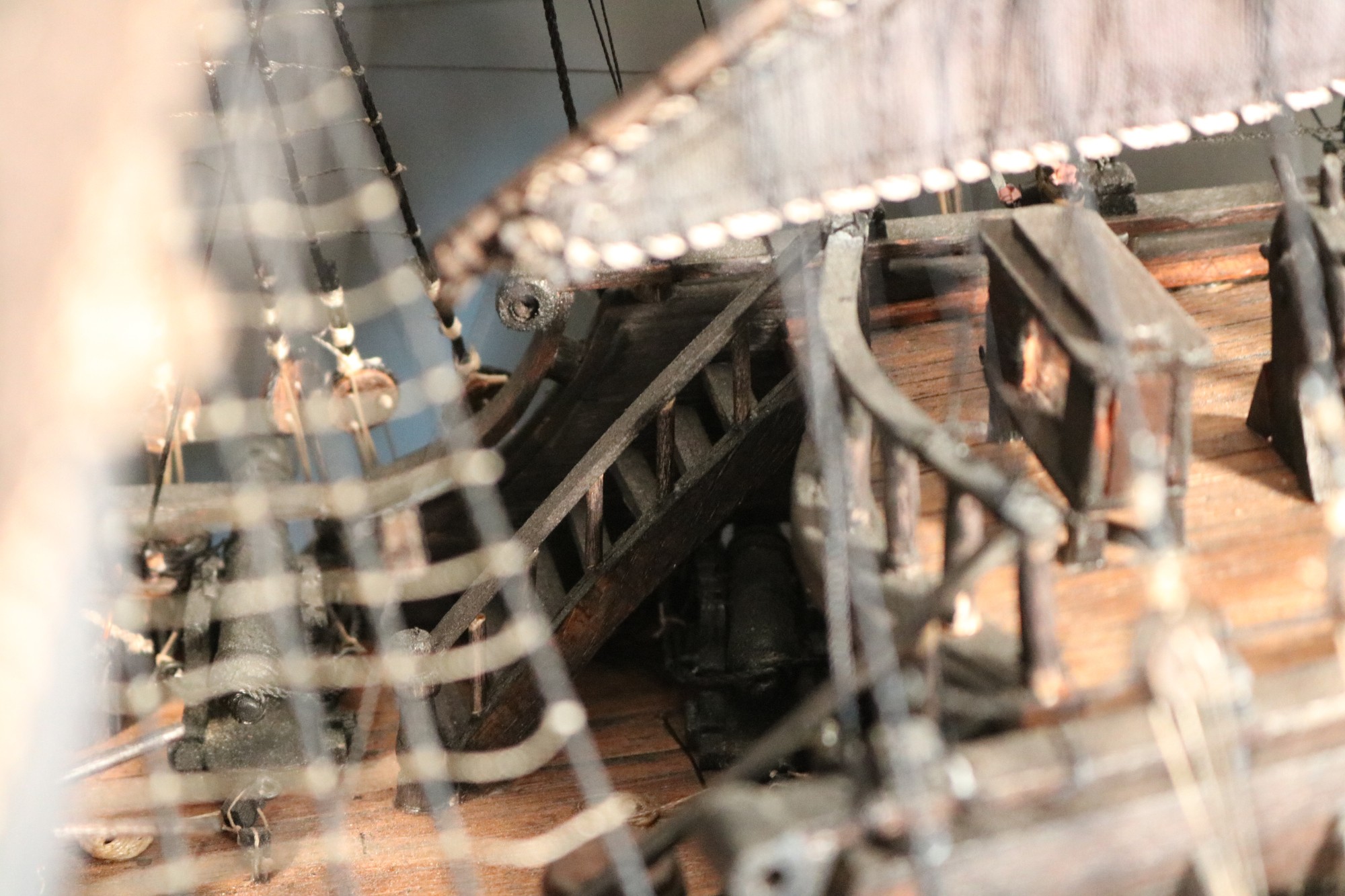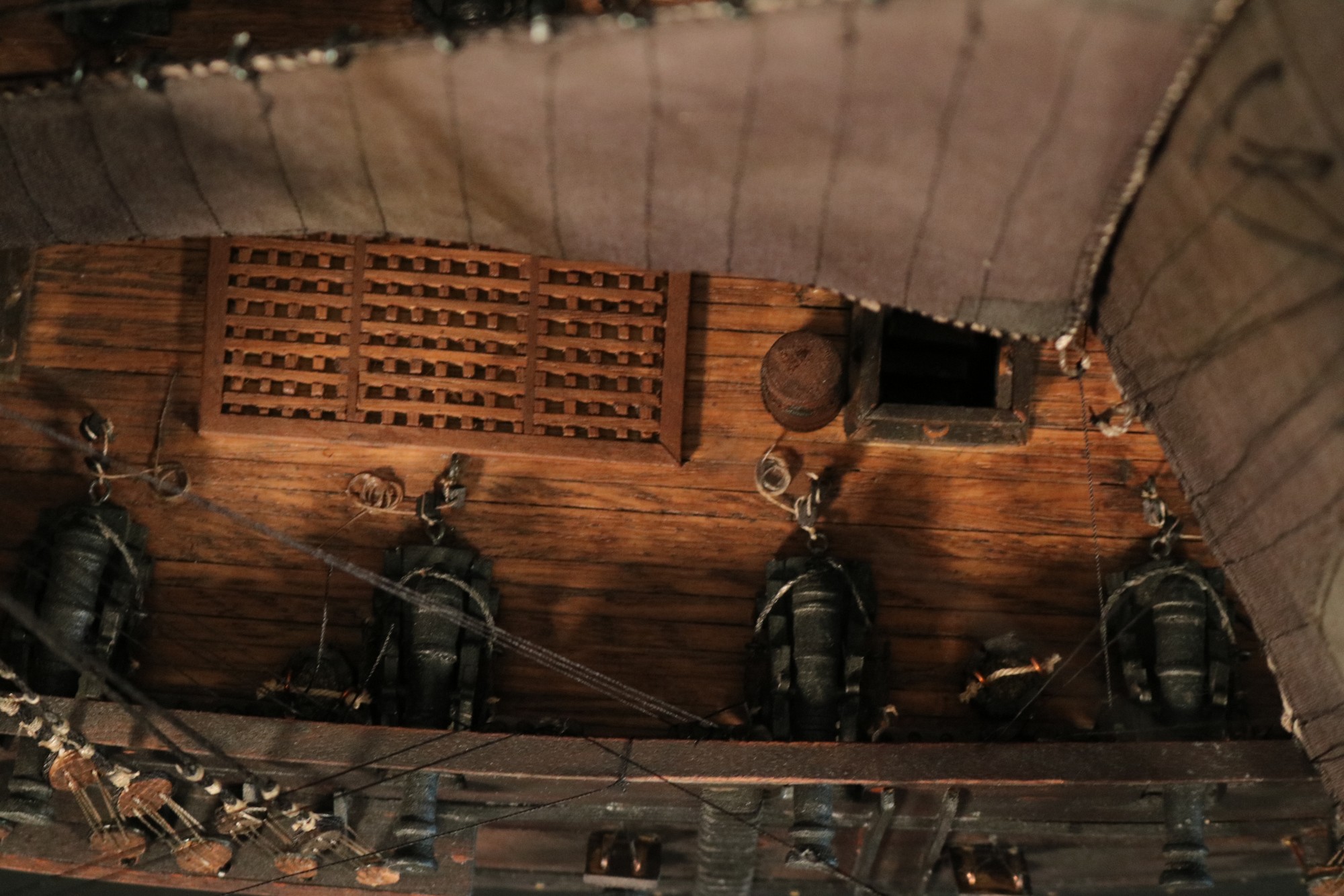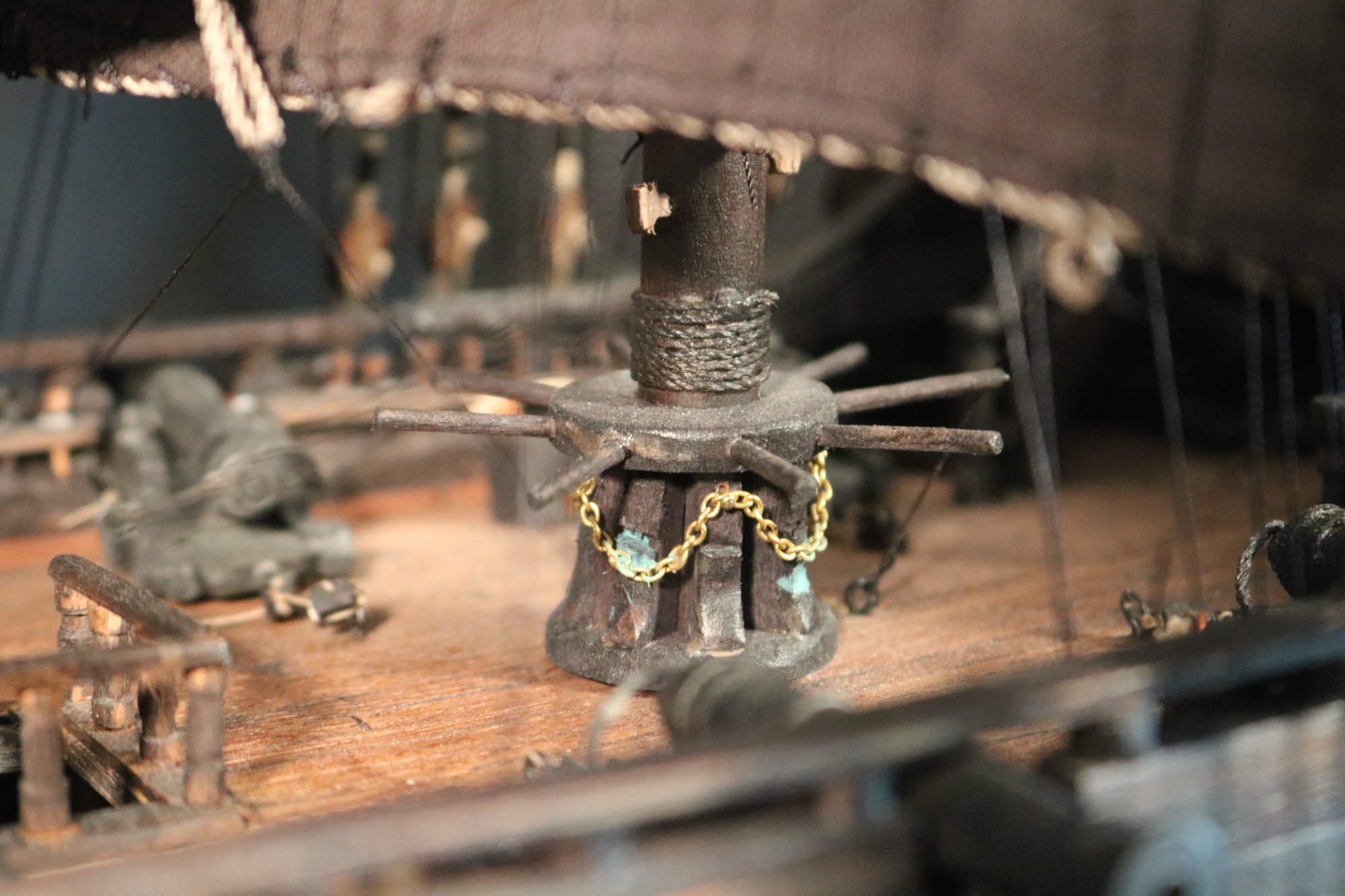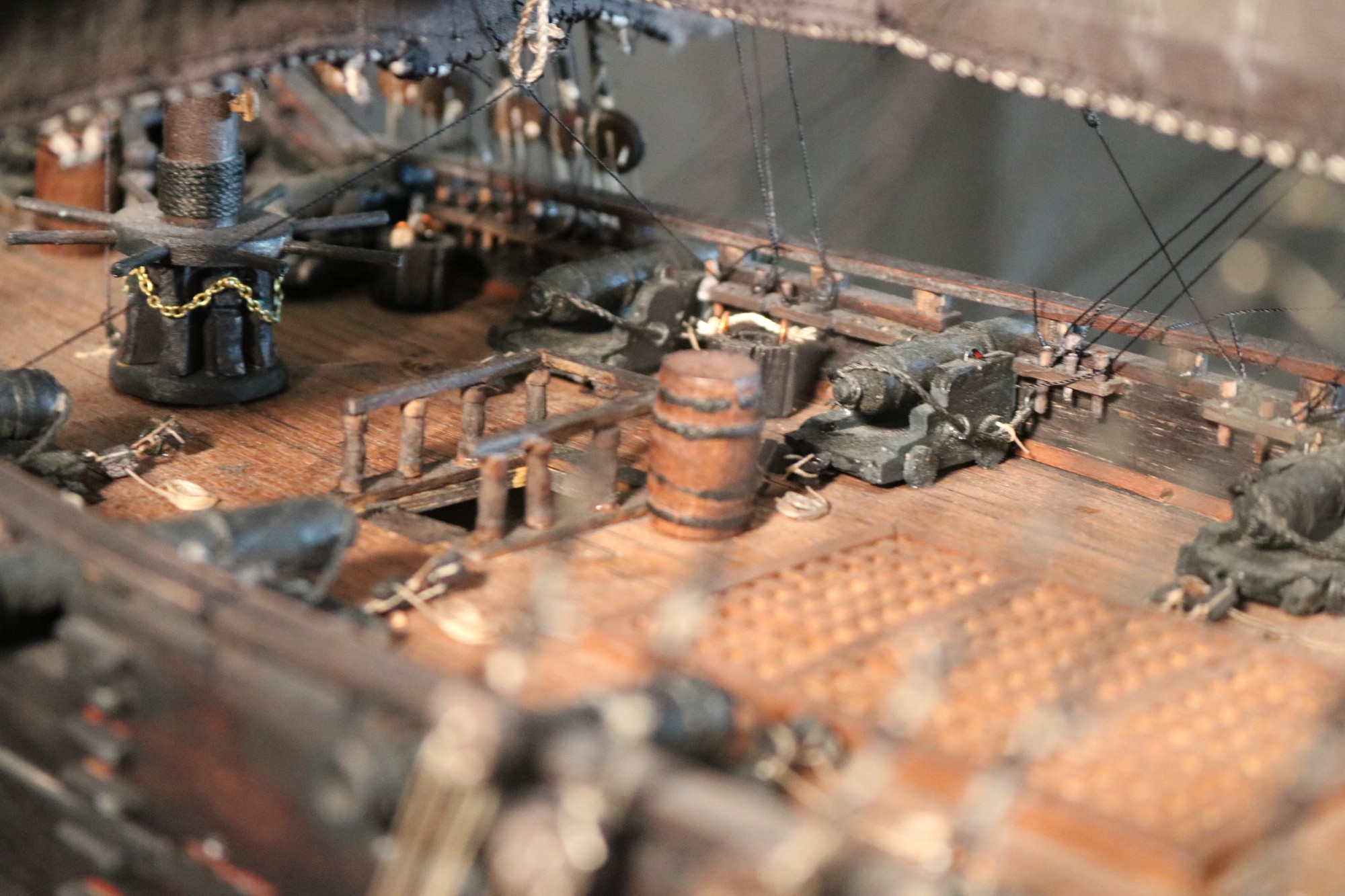 Con las mesas de guarnicion nos ha pasado algo parecido. Teniamos tres opciones, colocarla por debajo del cinton, por encima del cinton o sobre el cinton. Al final despues de consultar otros barcos de mas o menos el mismo periodo ( dentro de que la Perla Negra es un barco ficticio… ) decidí colocarlas sobre el cinton.