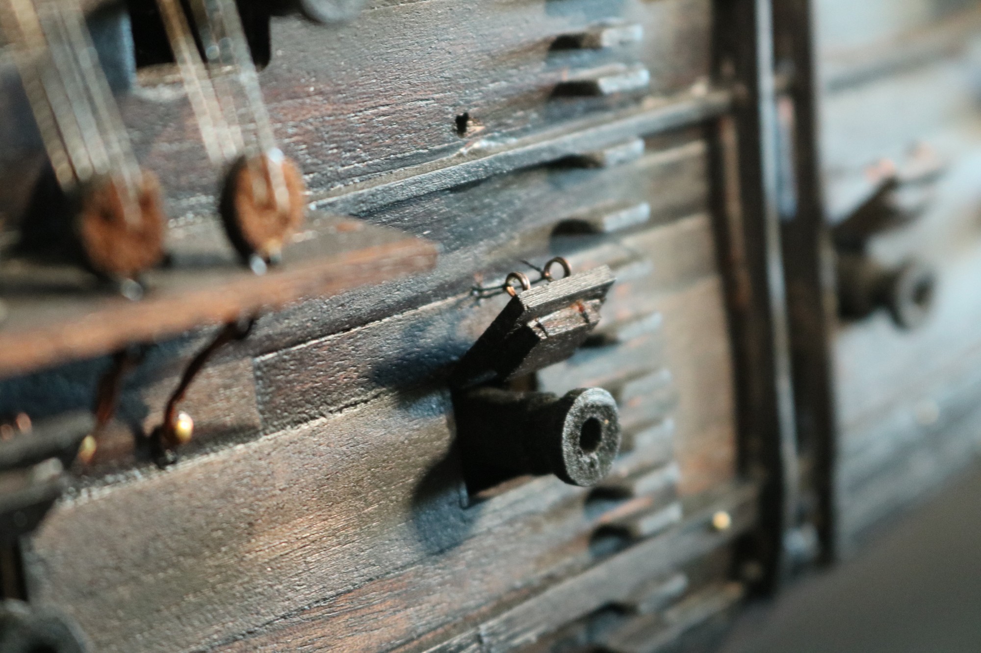 Las bisagras las he simulado y por ultimo he añadido los cáncamos que se ataran a los cabos que permitirán abrir la porta desde dentro. Una vez montado todo he añadido los cabos. Para otra ocasión los cabos los pondré antes porque ha sido difícil colocar cada cabo en su sitio y atarlos a las portas.