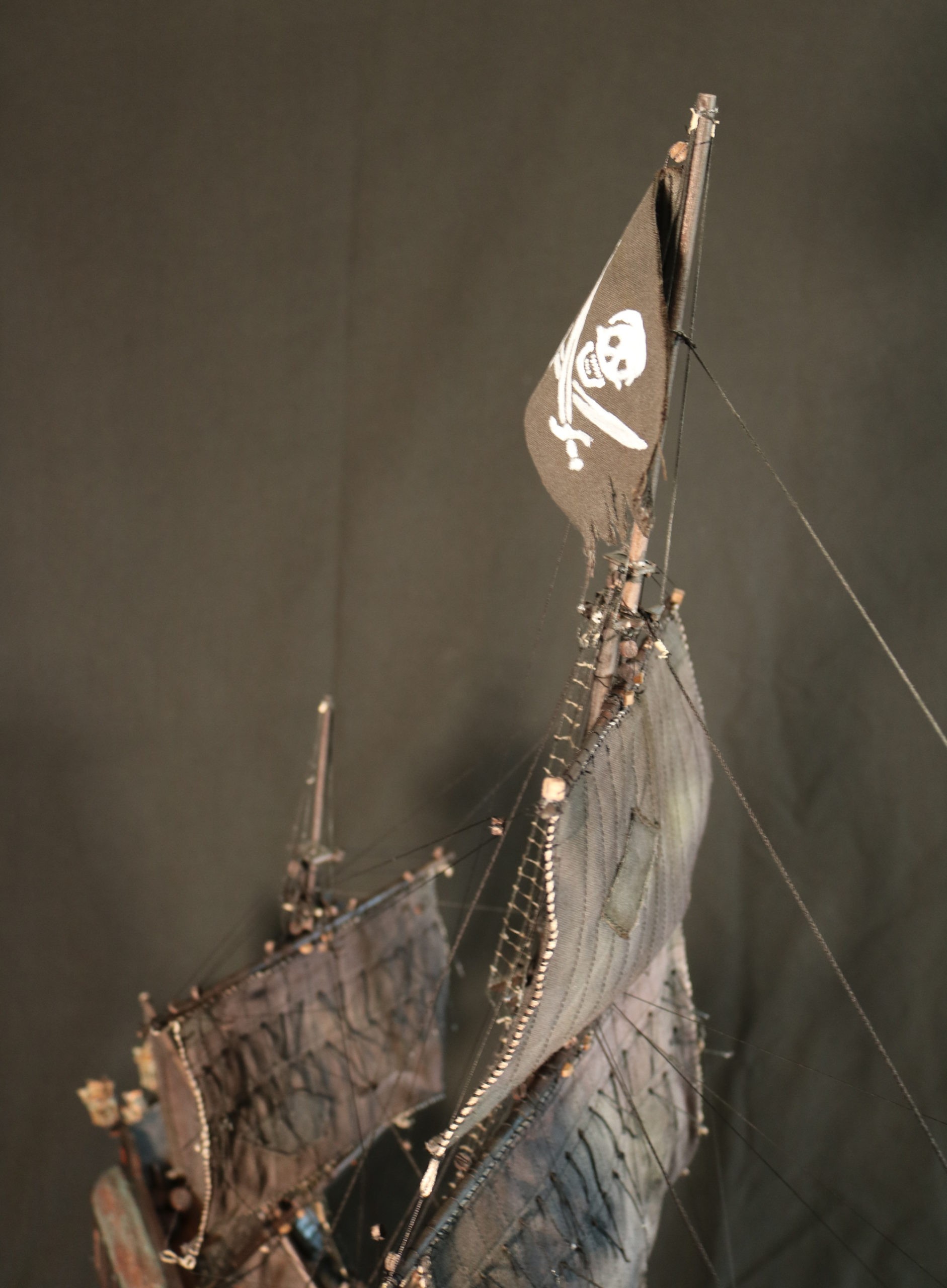 Para coronar la Perla Negra le he puesto la bandera pirata de “Calico Jack” Rackham. Si, no es la de Jack Sparrow, pero esta me parecio mas autentica con la idea de un barco pirata. La del Capitan Sparrow lleva una caravela mirando hacia la derecha a una golondrina roja.